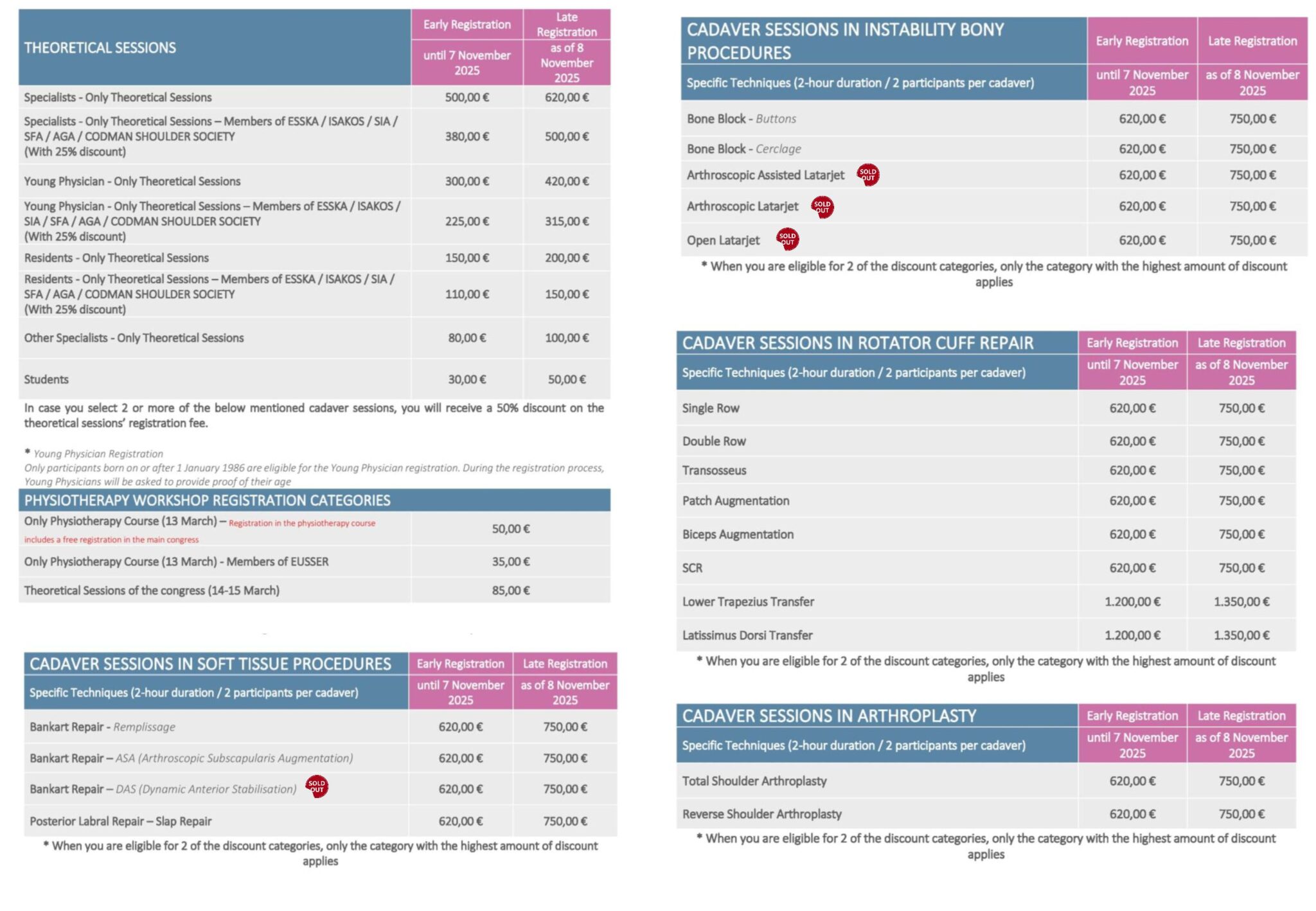 - There is a special registration fee for ESSKA, ISAKOS, SIA, FSA, AGA, CODMAN SHOULDER SOCIETY members. Only financially updated members are eligible to register in this category.